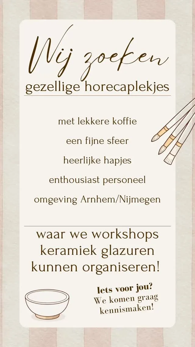 Wij kiezen er bewust voor om niet vanuit een eigen locatie te werken. Onze visie is dat iedereen moet doen waar hij of zij goed in is - en wij zijn goed in het begeleiden van workshops keramiek glazuren. Daar willen wij dan ook onze volle aandacht aan geven. Daarom werken wij met liefde samen met de leukste en lekkerste horecazaken. Zo volg je een fijne workshop van ons én geniet je van hapjes en drankjes, geserveerd door mensen die daar weer goed in zijn. Win-win, wat ons betreft!